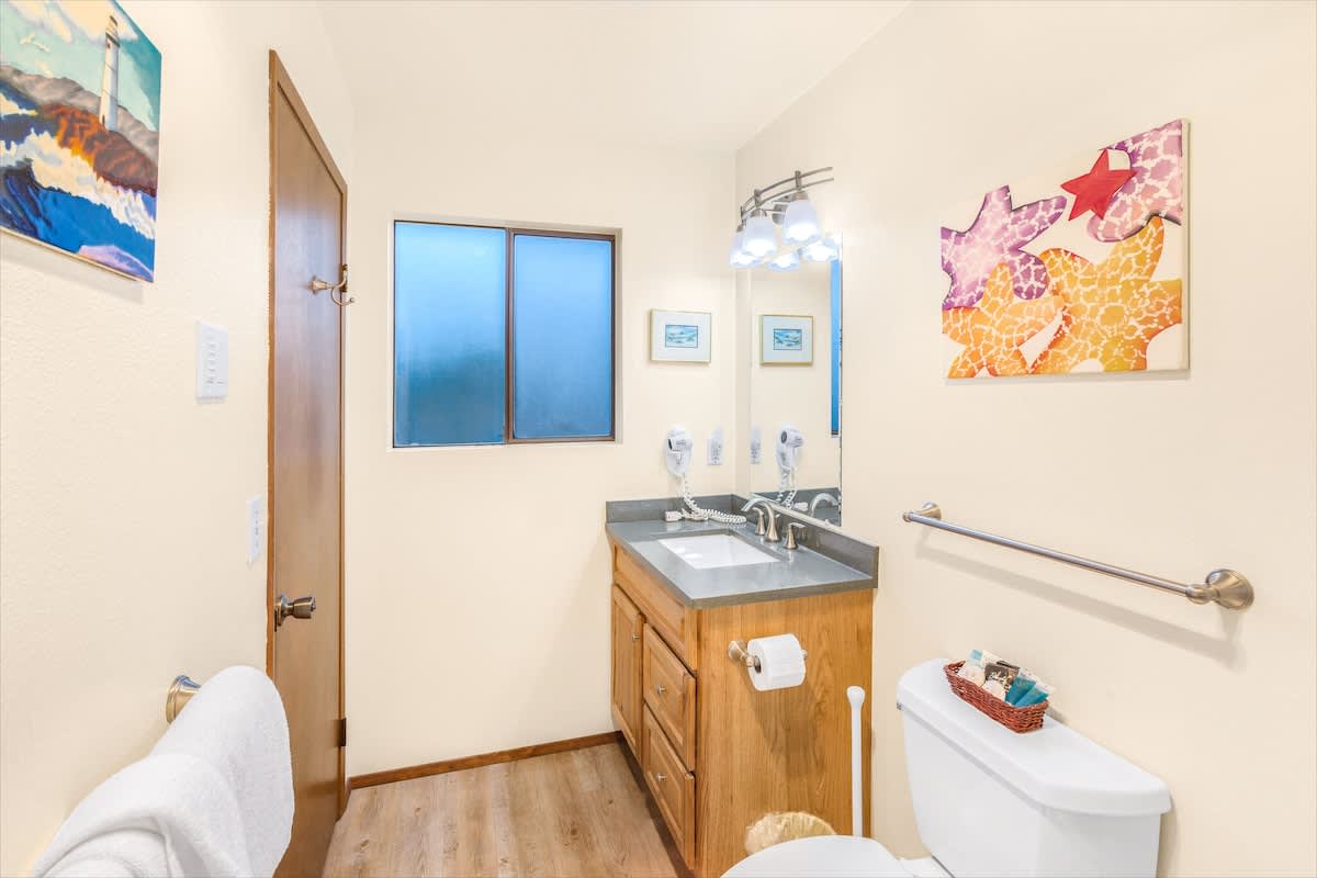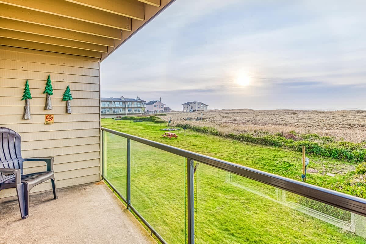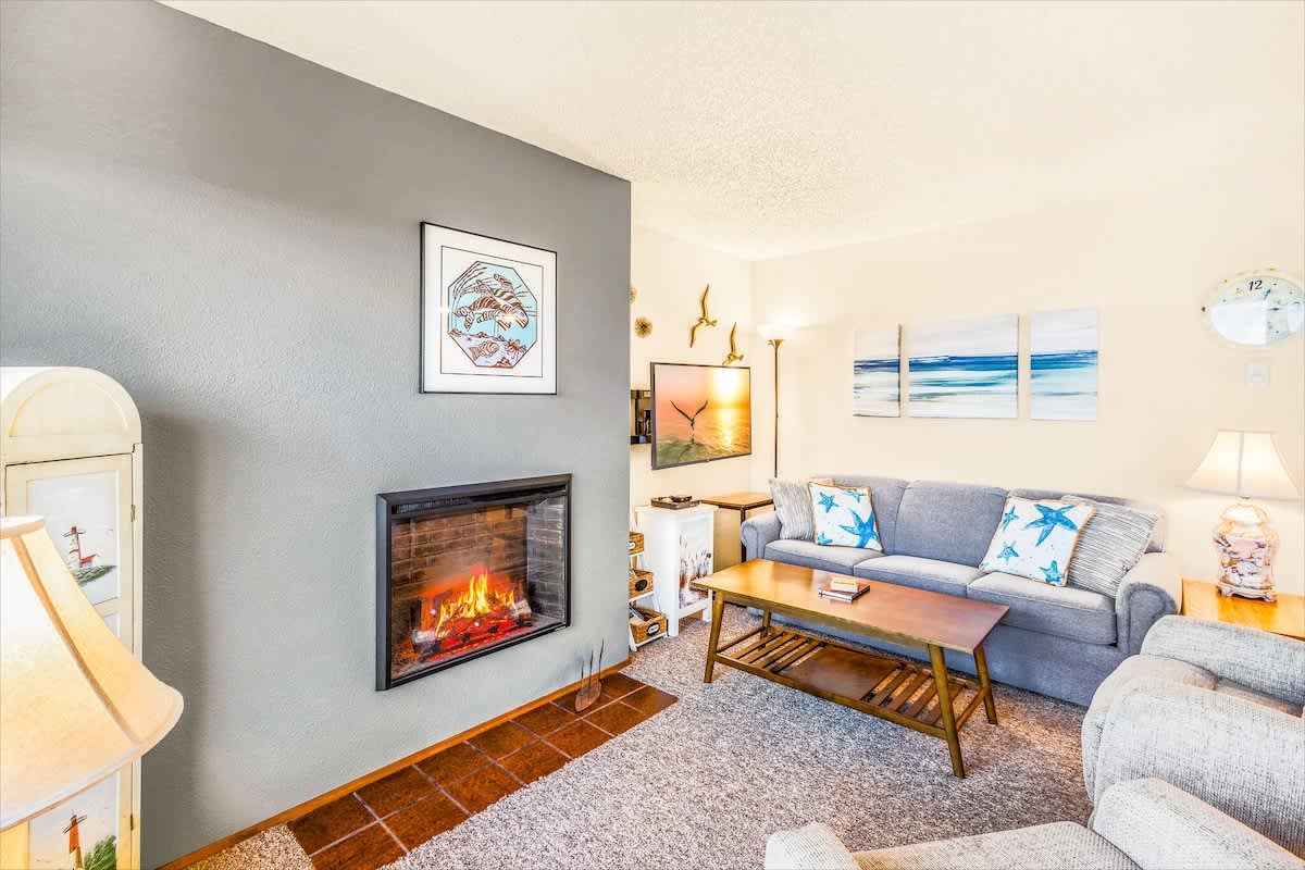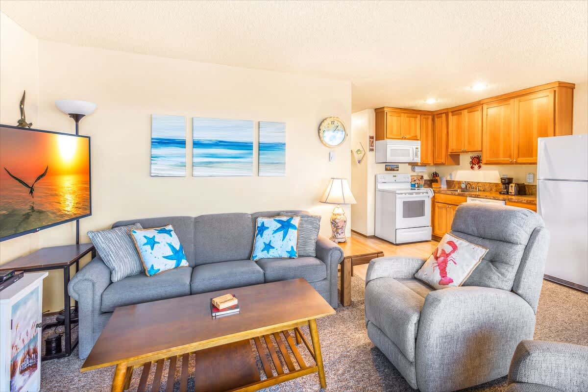 An inviting living area features a couch, coffee table and two extremely comfortable recliners, all centered around a new 43" SMART TV with a BluRay DVD player and an eco-friendly fireplace. From here, you can take in a cinematic view of the Pacific Ocean, the dunes, and the seabirds that flit above them. In good weather, you can adjourn to the private deck to smell the fragrant sea air. Dogs are welcome with our standard per dog, per night fee.