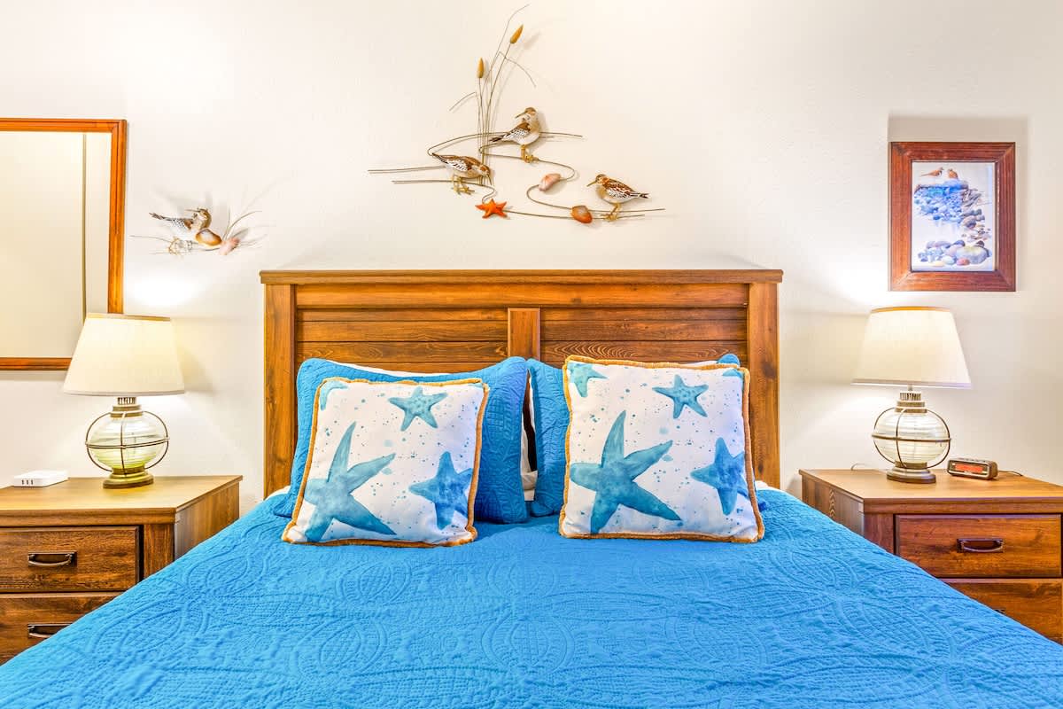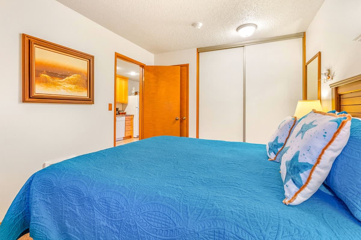 The bedroom features a high-quality queen bed and a small TV with a DVD player to help you wind down at the end of your day. The condo is also supplemented with a sleeper sofa in the living area for up to two additional guests. A full kitchen is stocked with pots, pans, flatware and everything you need to cook your own meals before enjoying them in the adjacent dining area.