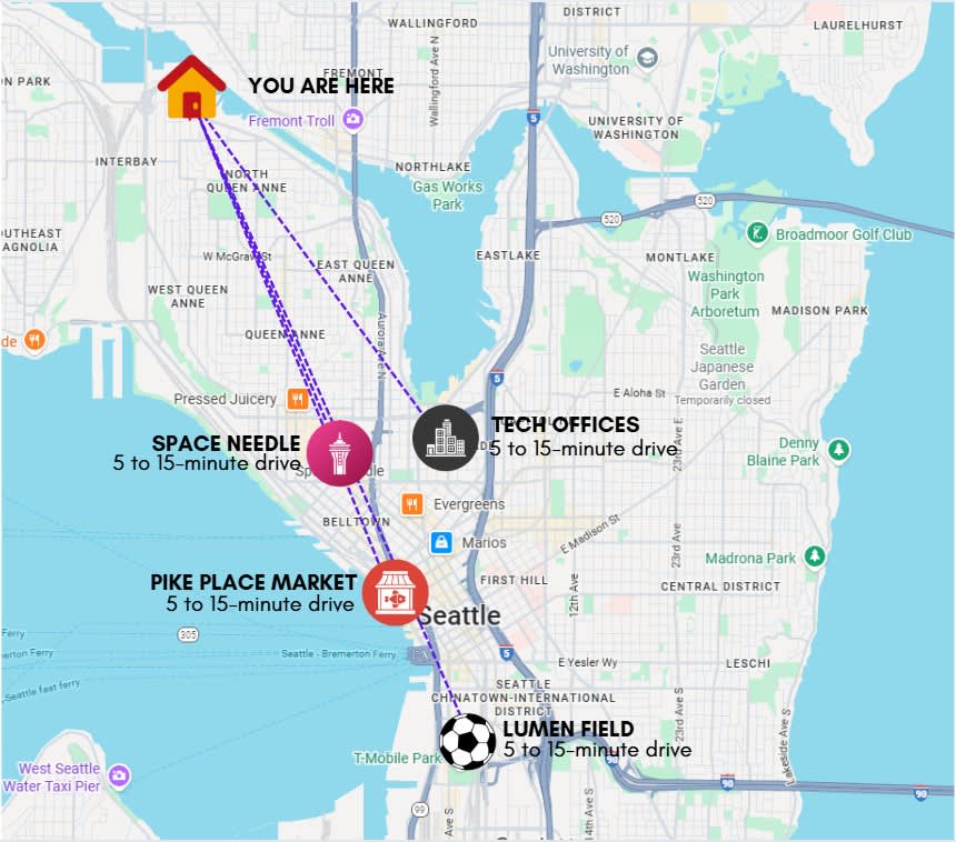You’re close enough to downtown to catch a show or meeting on short notice, but tucked away in a quieter residential pocket that feels worlds apart from the bustle. It’s Seattle convenience without the constant noise — a sweet spot for both visitors and locals in the know.